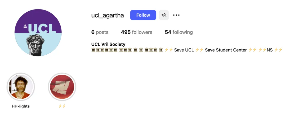 @ucl_agartha (herein referred to as UCL Agartha) is unaffiliated with UCL and is not recognised by the Students' Union despite claiming to be a society and using the UCL logo in their profile picture.