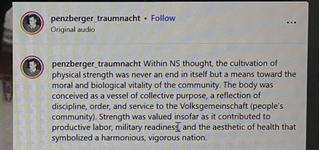 This quote comes from one of the few accounts UCL Agartha follows which is not a fellow university Agartha society. The username "Penzberger Traumnacht" (dream night) almost certainly references Penzberger Mordnacht (murder night), a Nazi massacre which the account name seems to endorse.