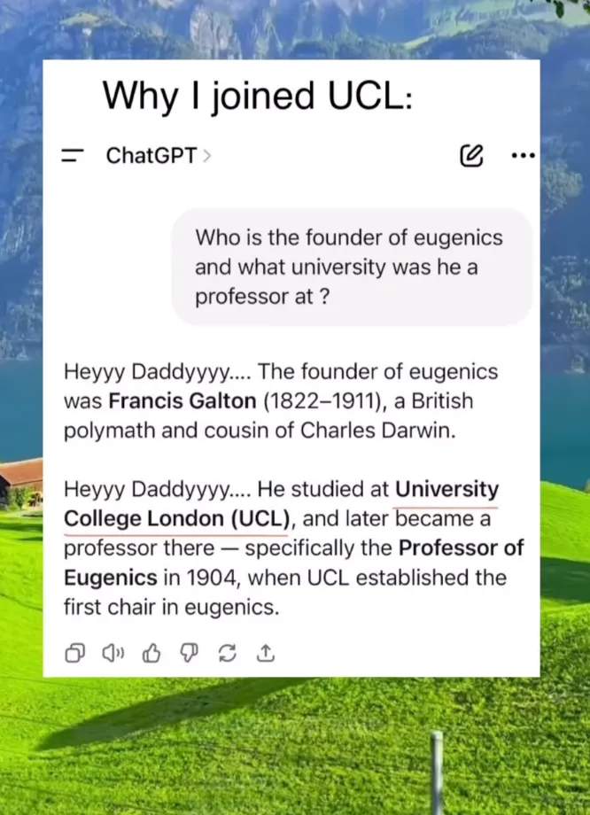 The account's most popular reel features a picture of UCL's QS world ranking of nine, accompanied by the text: "Why you joined UCL". The text then changes to, "Why I joined UCL" with an image detailing the University's past as the pioneer of eugenics.